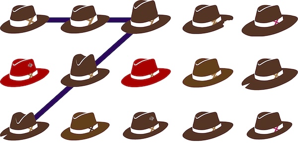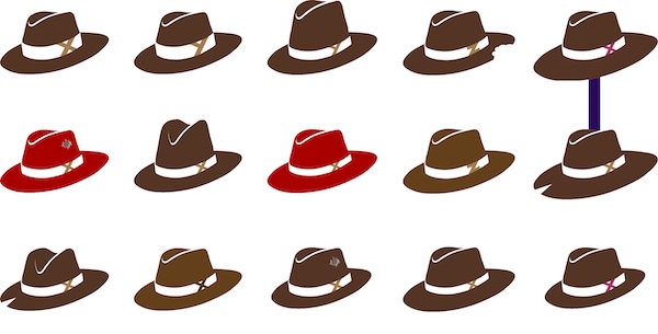 Vous devez commencer par le chapeau en haut à gauche. Avez-vous remarqué quel est son défaut ? Si on le compare au chapeau « moyen », on voit que son bandeau est un peu trop large. Ce défaut correspond à une de ses deux lettres, il va falloir l’éliminer. Le message caché commence donc par « C » ou par « R ».