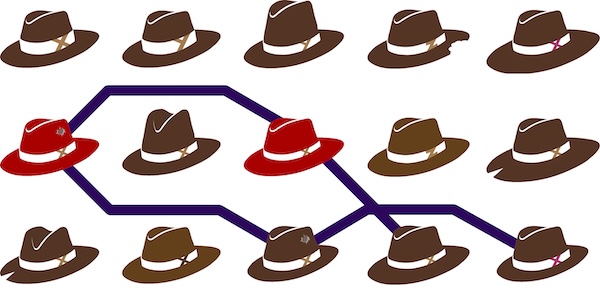 Le 3e chapeau partage le même défaut que le 2e, il possède un nœud en Y au lieu de X. En regardant les lettres en commun entre ces deux chapeaux on peut identifier la lettre correspondant à ce défaut, il s’agit du « V ». On peut donc l’éliminer de ces 2 chapeaux. Le message commence donc par « CE ». La 3e lettre sera soit « A » soit « L ». En identifiant un autre défaut sur ce chapeau, on pourra identifier le 4e chapeau.