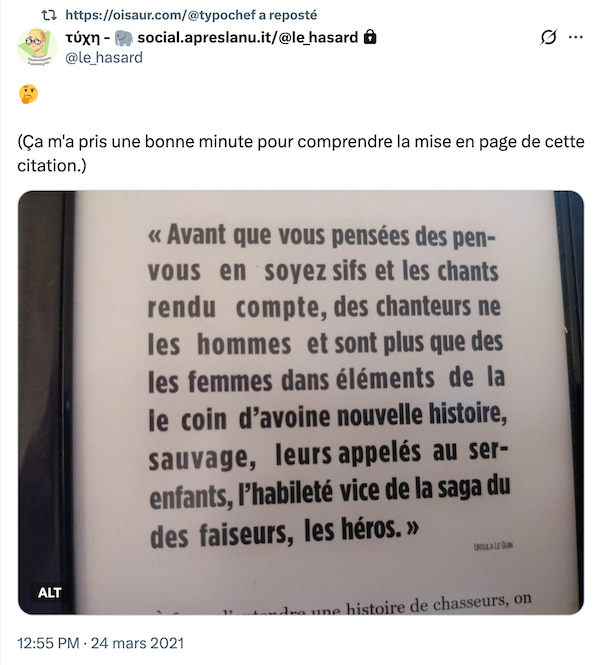 Visualisez bien ce que vous avez entre les mains. La mise en page très particulière à ce type de support est la même que celle utilisée ici, mais de manière un peu fourbe parce que les espaces ont été diminués.